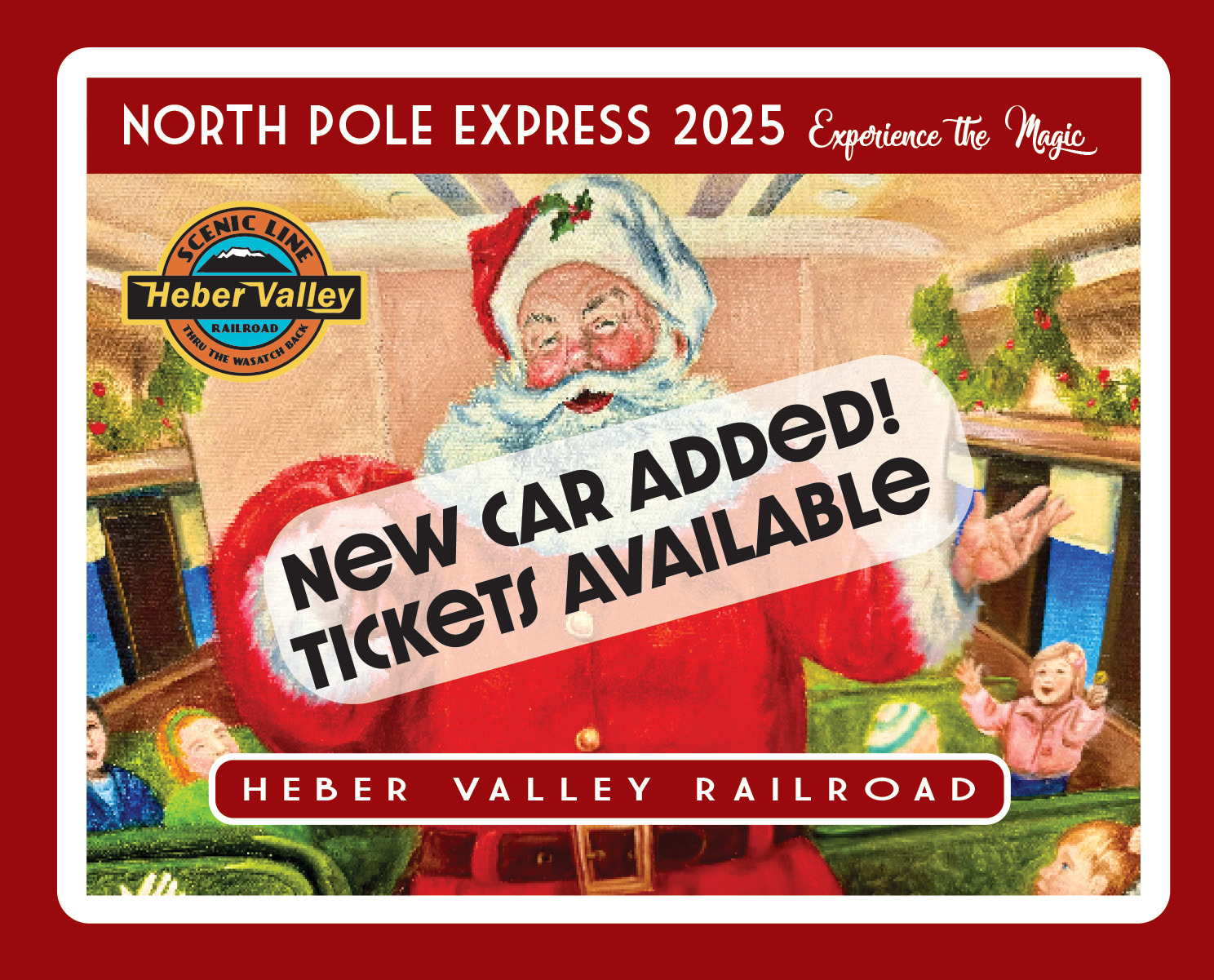 Friday, November 14th we will add another train coach to the 2025 North Pole Express. A limited number of tickets will be available in our new “Silver Scene” Dome car, which includes 20 seats in tables for four, 20 individual seats in the beautiful lounge, and 24 seats in “Dome” – sold in groups of four. A total of 64 seats are available in the car.