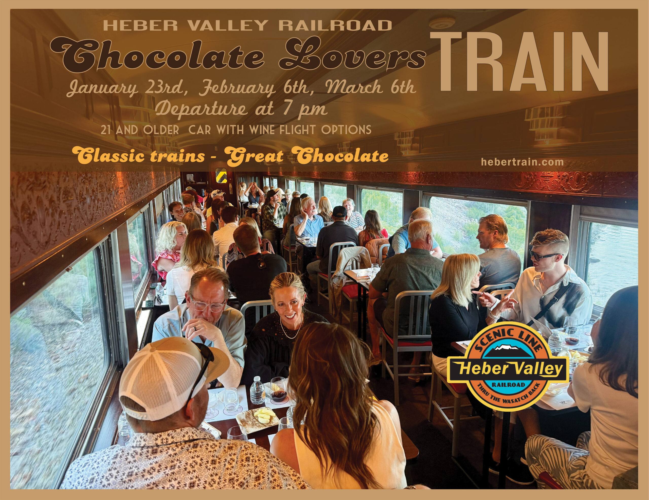 Join us on the Chocolate Lovers Train! A great date night. 90 minute round trip evening ride. General Admission and VIP First Class tickets available. Great chocolate samples – including local artisans. Age 21 and older VIP options with four-taste wine flight with chocolate. Fun for all.